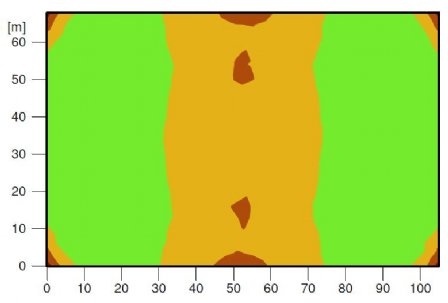 نمودار رنگي False Color زير مقدار شدت روشنايي را بر روي سطح زمين نشان مي دهد. خلاصه نتايج محاسبات روشنايي در مورد اين زمين عبارتند از: شدت روشنايي متوسط: 209 لوکس حداکثر شدت روشنايي: 148 لوکس شدت روشنايي حداقل به متوسط: 0.71 شدت روشنايي حداقل به حداکثر: 0.56